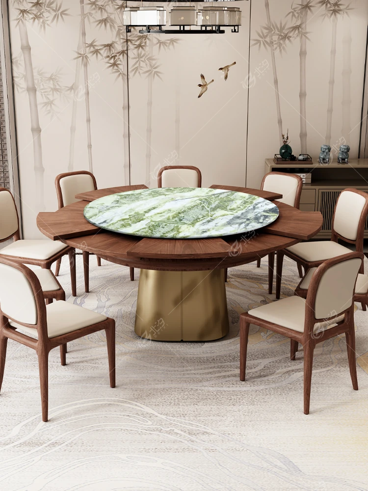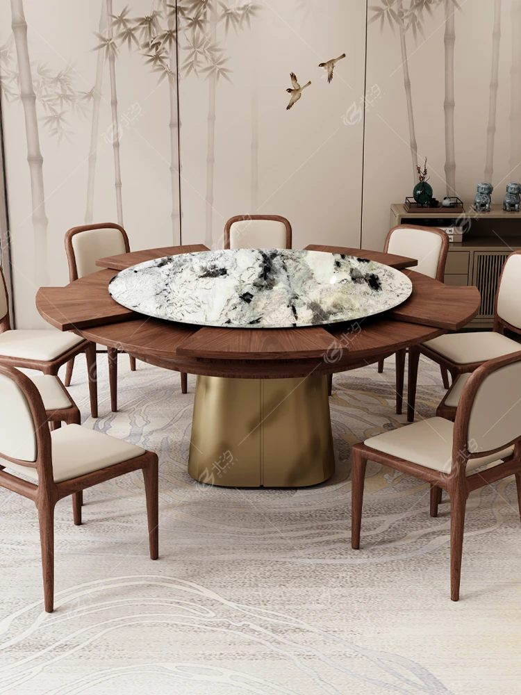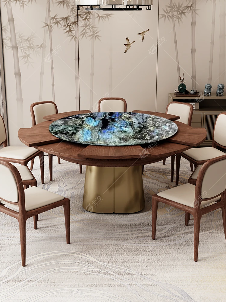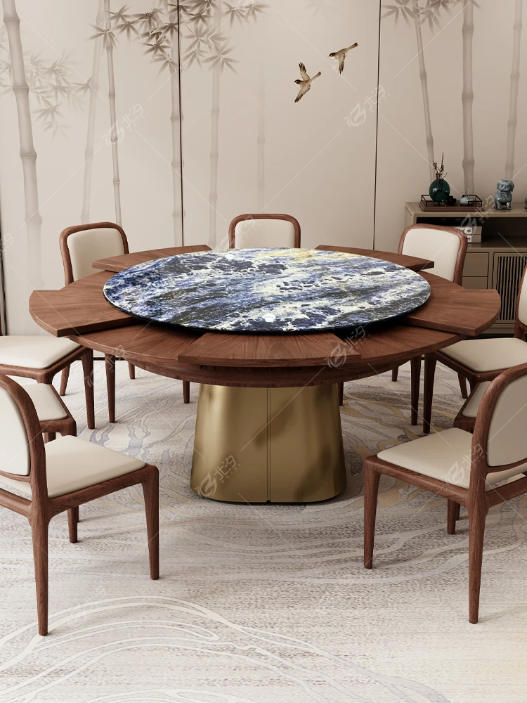 新中式スタイルの岩板実木大丸テーブル - 電磁調理器付き、ホテル用火鍋セット、回転卓と椅子の組み合わせで豪華なダイニング体験を提供!