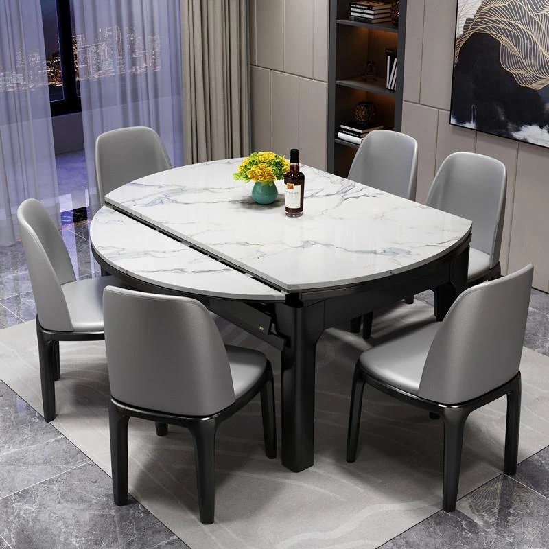 現代的なシンプルスタイルの大理石ダイニングテーブルとチェアのセット - 丸型と四角型の2way折りたたみ式、伸縮可能で小型住宅に最適なラグジュアリーな岩板テーブル!