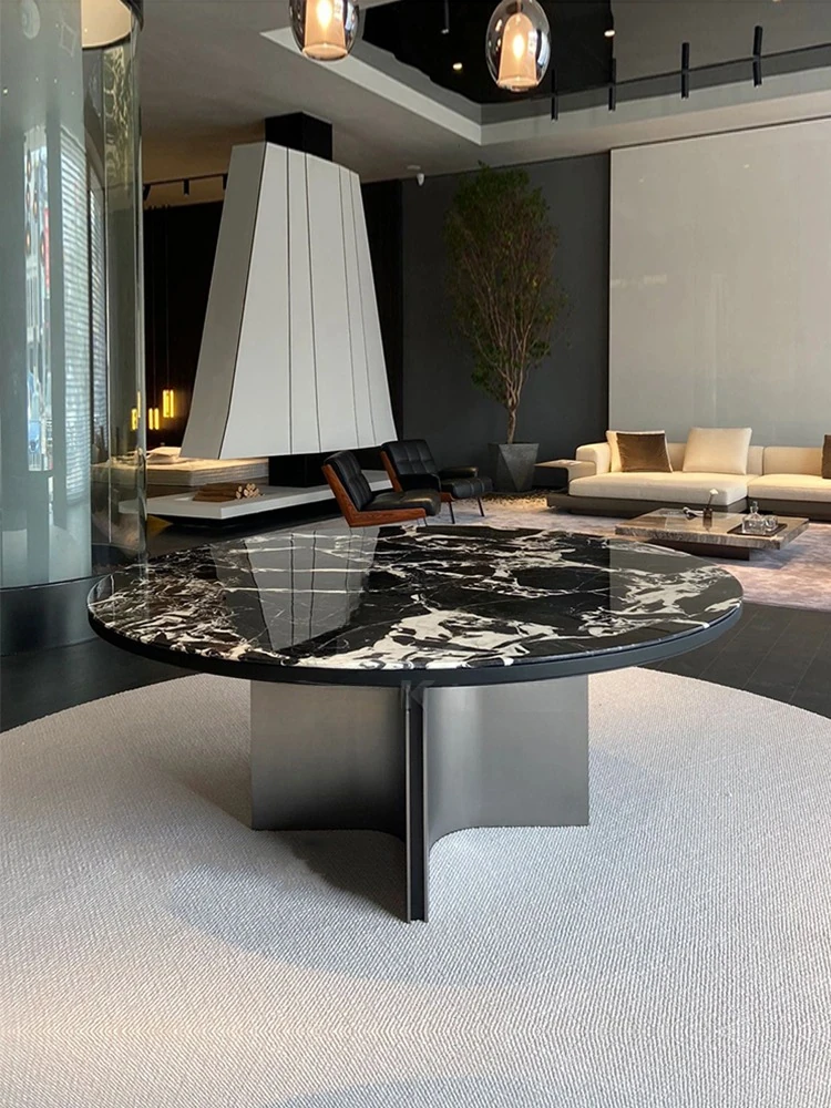 ナポレオンブラック天然大理石ラグジュアリー食卓|モダン&ミニマリストデザイン|高級感溢れる別荘用ダイニングテーブル|エレガントな円形テーブルで、特別なひとときを演出!