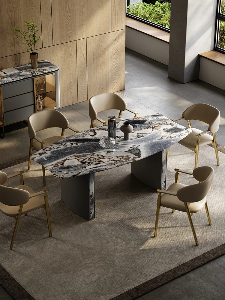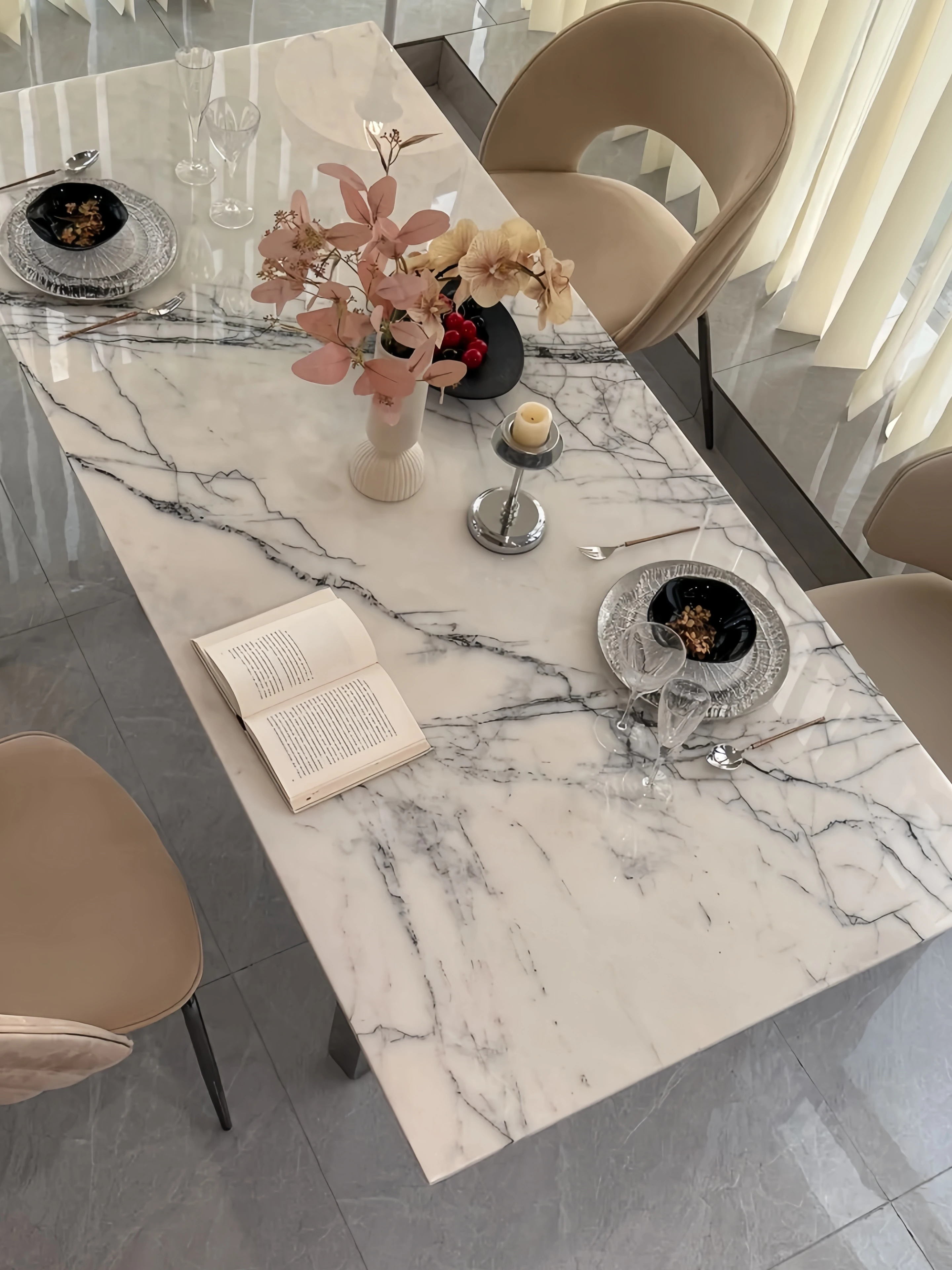 イタリアンミニマリズムの天然大理石ダイニングテーブル - モダンな長方形デザインで、スタイリッシュな食事空間を演出。新作のクリエイティブな食卓で、家族や友人との特別なひとときをお楽しみください!