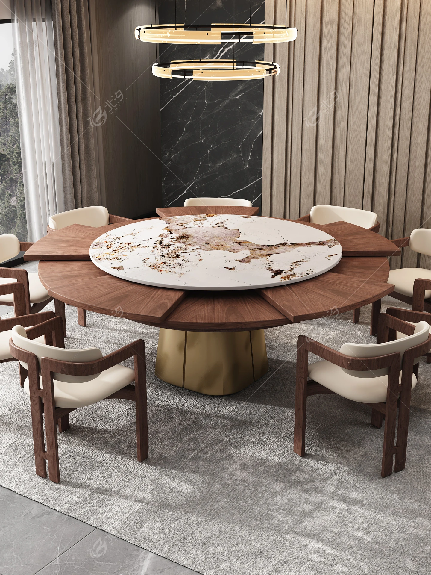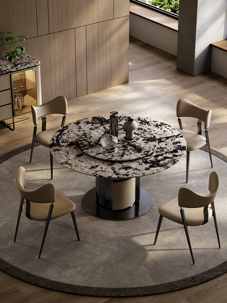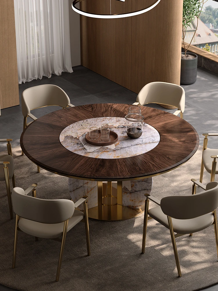 高級感あふれるラウンド木製ダイニングテーブル - ヴィラ向け、回転式大理石天板付き、豪華な内嵌デザインで食事をもっと楽しむ!