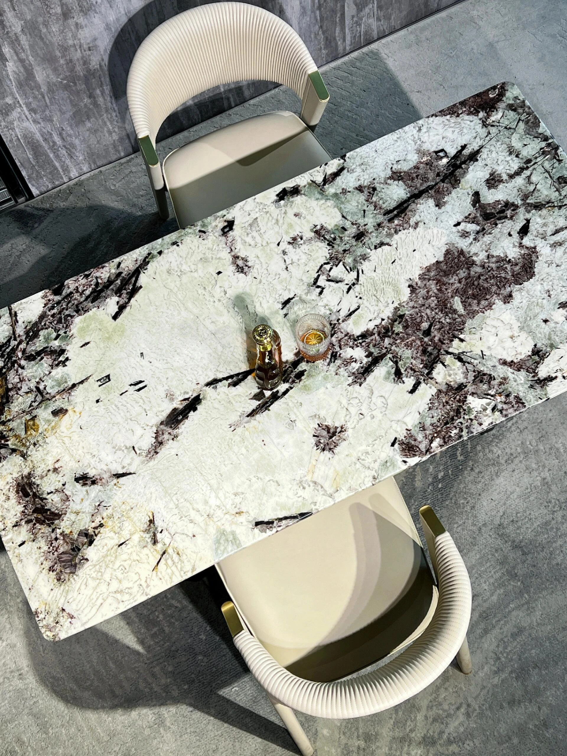 ラグジュアリーな天然大理石のダイニングテーブル|モダンなデザインで魅せる高級別荘向け|スタイリッシュなテーブル&チェアのセットで、洗練された空間を演出!