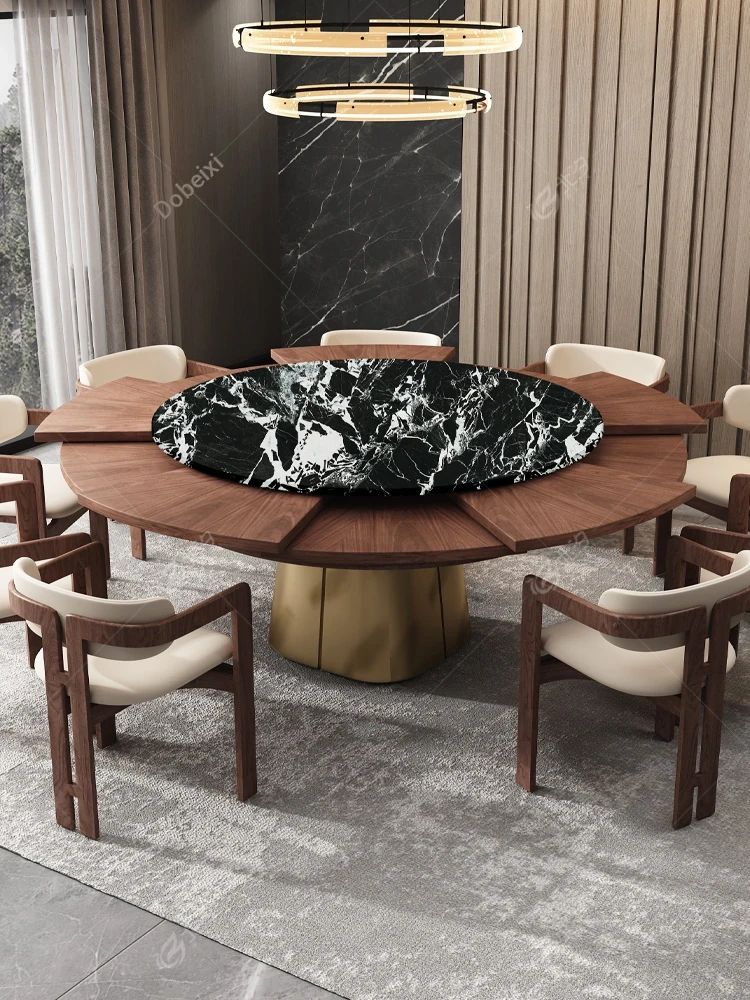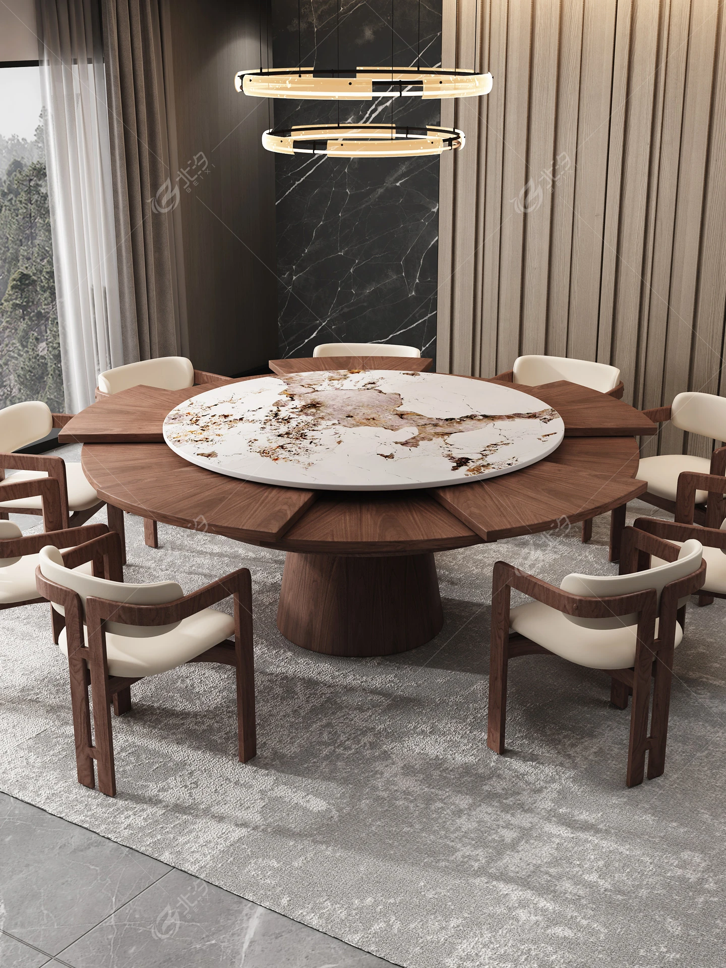 Expandable Round Fletcher Transforming Dining Table - Rotating Solid Wood Dining Table with Cloisonné Luxury Stone Design for Elegant Restaurants
