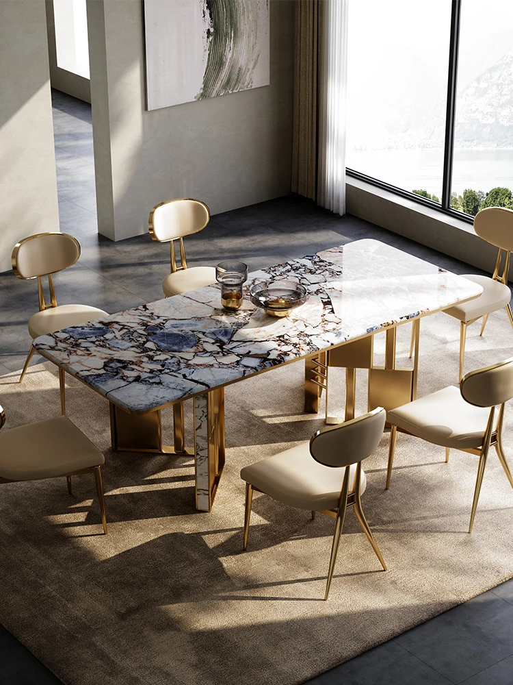 Luxury Designer Rectangular Dining Table Set with Natural Snow Mountain Blue Lapis Lazuli Stone - High-End Home Dining Furniture Combination
