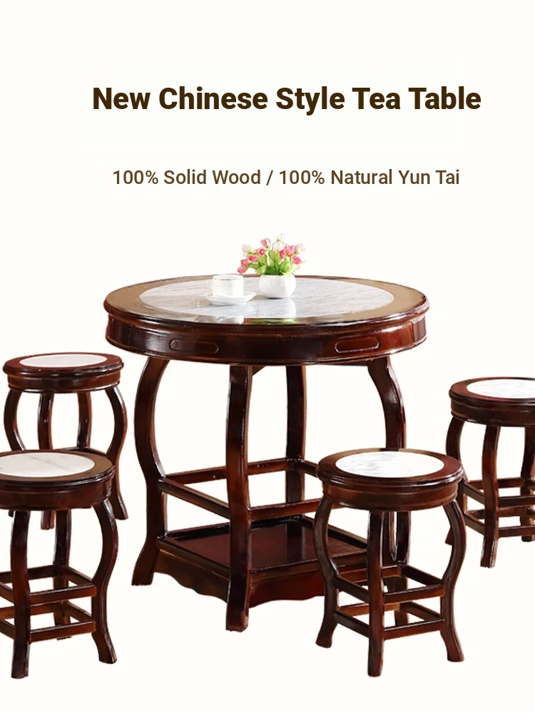 Antique Chinese Style Solid Wood Round Table with Marble Top – Perfect for Dessert Shops, Quick Service Restaurants, and Snack Bars – Includes Comfortable Chairs for a Cozy Dining Experience