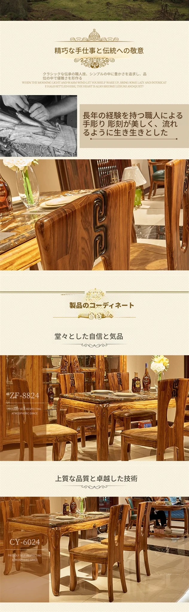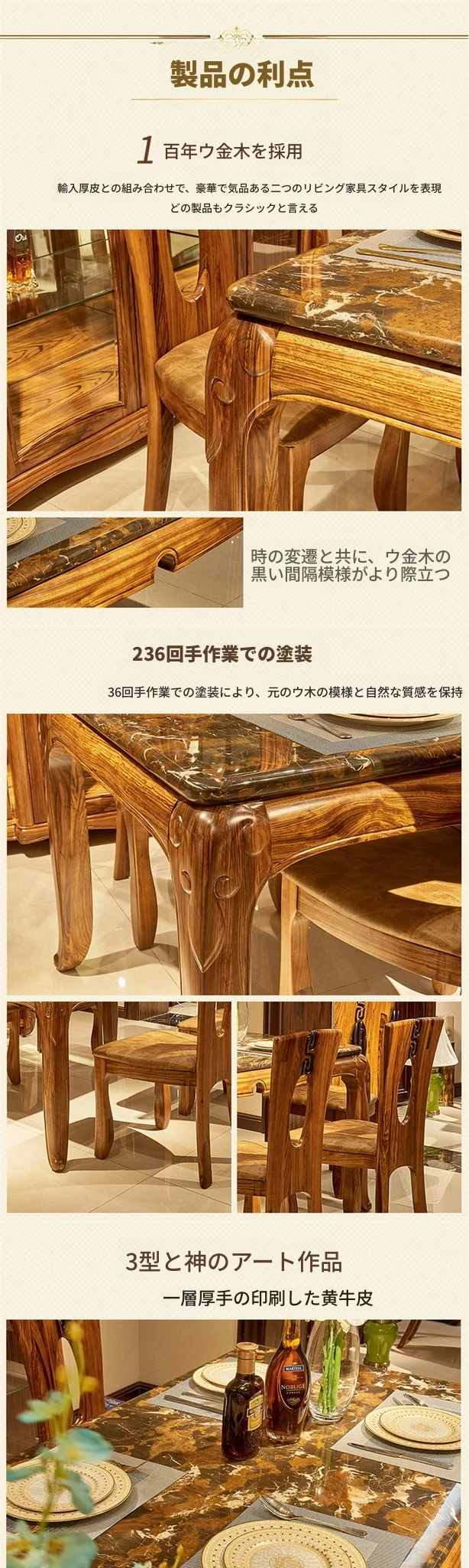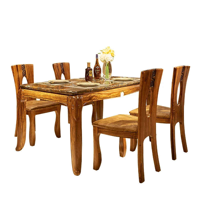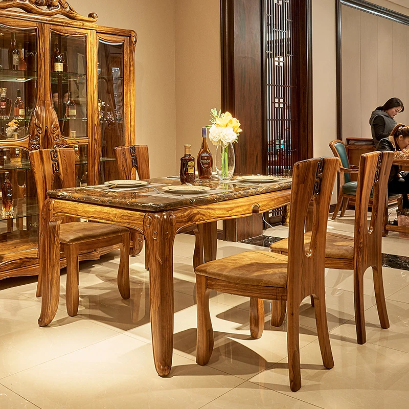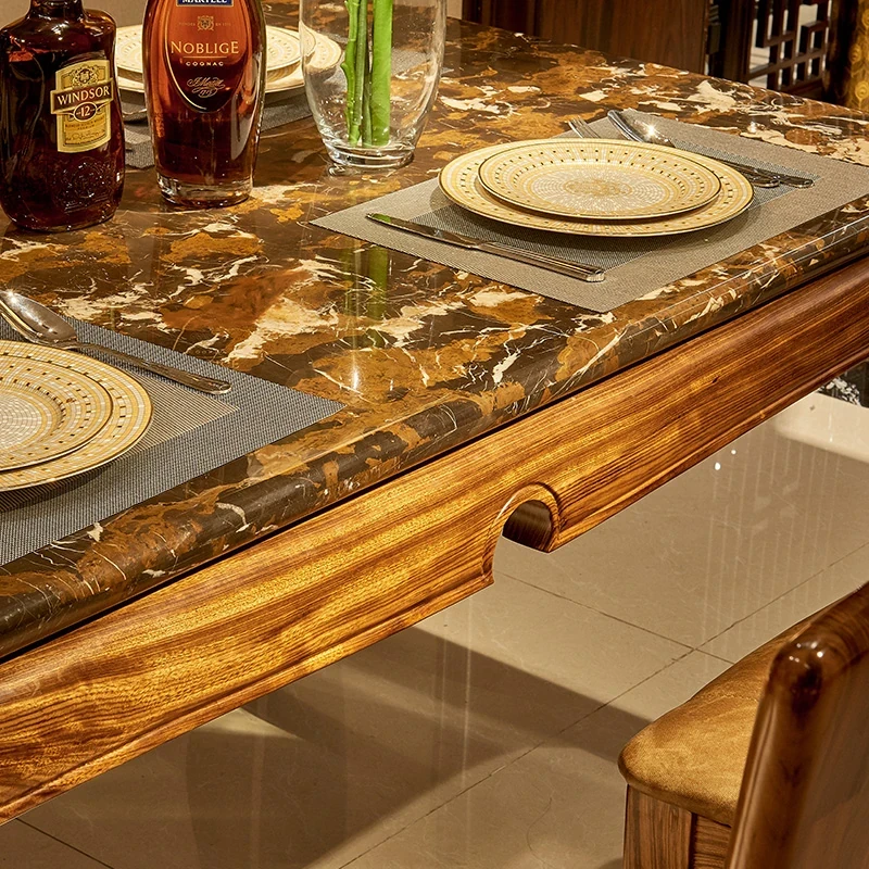 新中式デザインの無垢材ダイニングテーブル - 欧風スタイルの長方形テーブル、ウッディな質感と大理石の美しさを融合。家庭での特別なひとときを演出する、スタイリッシュな食卓セット!