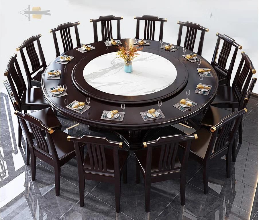 新中式スタイルの岩板実木大丸テーブル - 電磁調理器付き、ホテル用火鍋セット、回転卓と椅子の組み合わせで豪華なダイニング体験を提供!